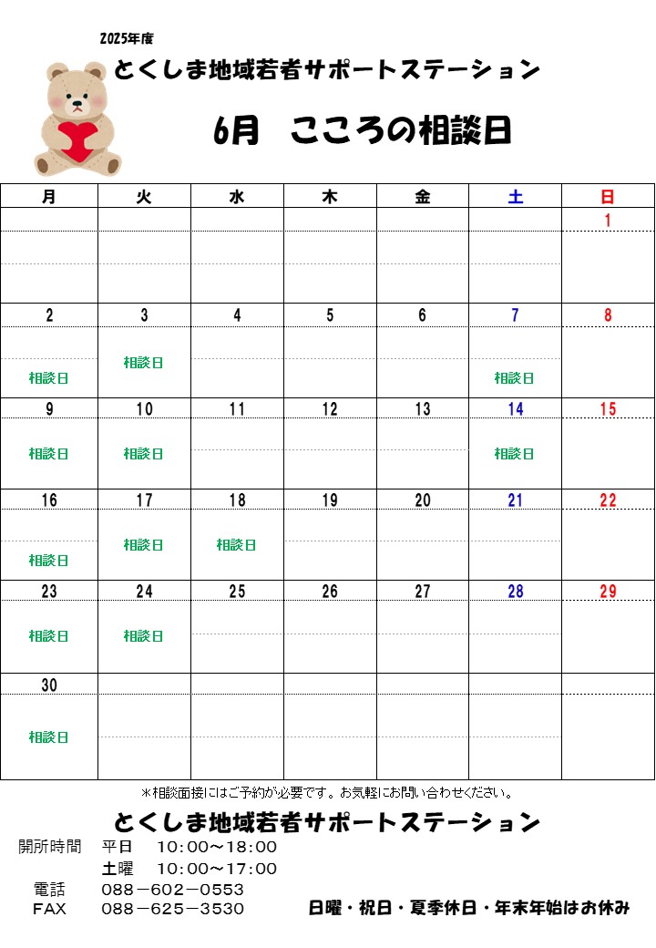 6月の「こころの相談日」の日程をお伝えします。
