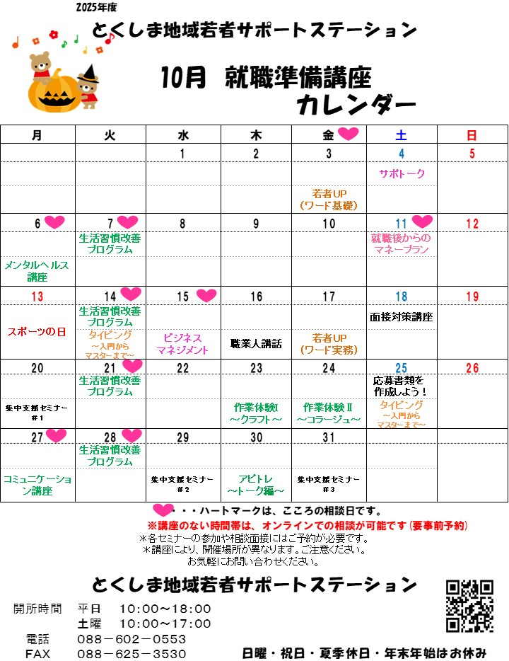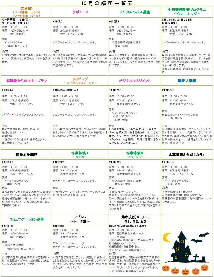 各セミナーの参加や相談は事前のご予約をお願いしております。気になる講座がございましたら、お気軽に、とくしま地域若者サポートステーションまでお問い合わせください。