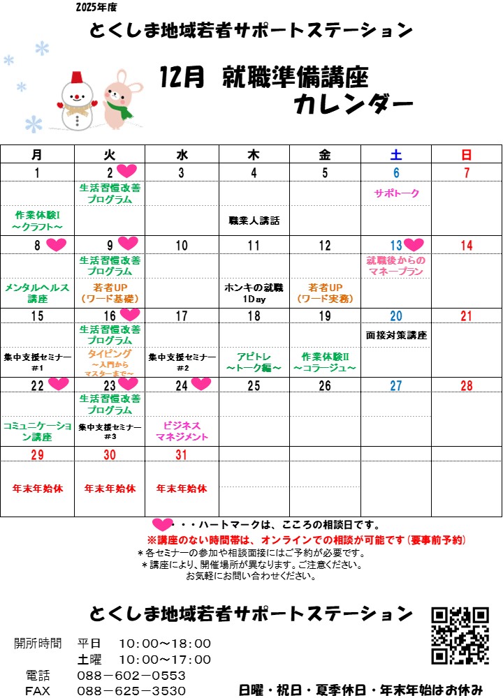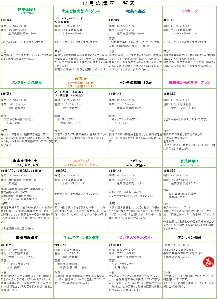 気になる講座がございましたら、お気軽に、とくしま地域若者サポートステーションまでお問い合わせください。